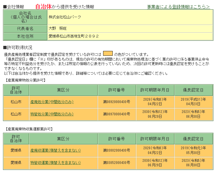 (財)産業廃棄物処理事業振興財団の「産廃情報ネット」に以下の情報を掲載しています。 • 中間処理の区分、取扱い品目など • 過去3年間の処分量、収集運搬など • 財務諸表など